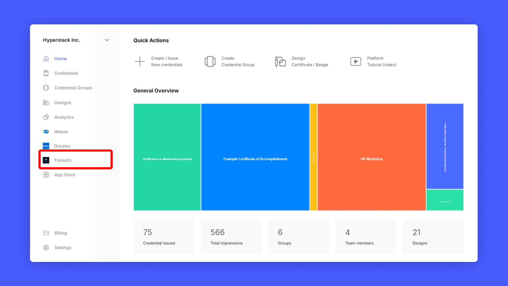 Hyperstack is a platform that allows you to issue certificates/badges to your participants in a hassle-free way. You don't need to worry about collecting participant's details manually. With this integration, you can automatically issue certificates to your participants when they complete the course.