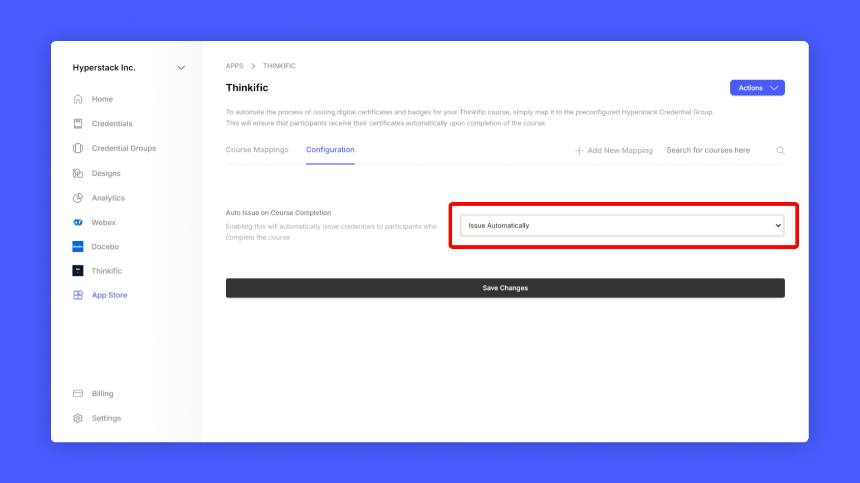 Step 8: You have successfully mapped your Thinkific course with Hyperstack. Now, we need to enable auto-issuance of certificates.