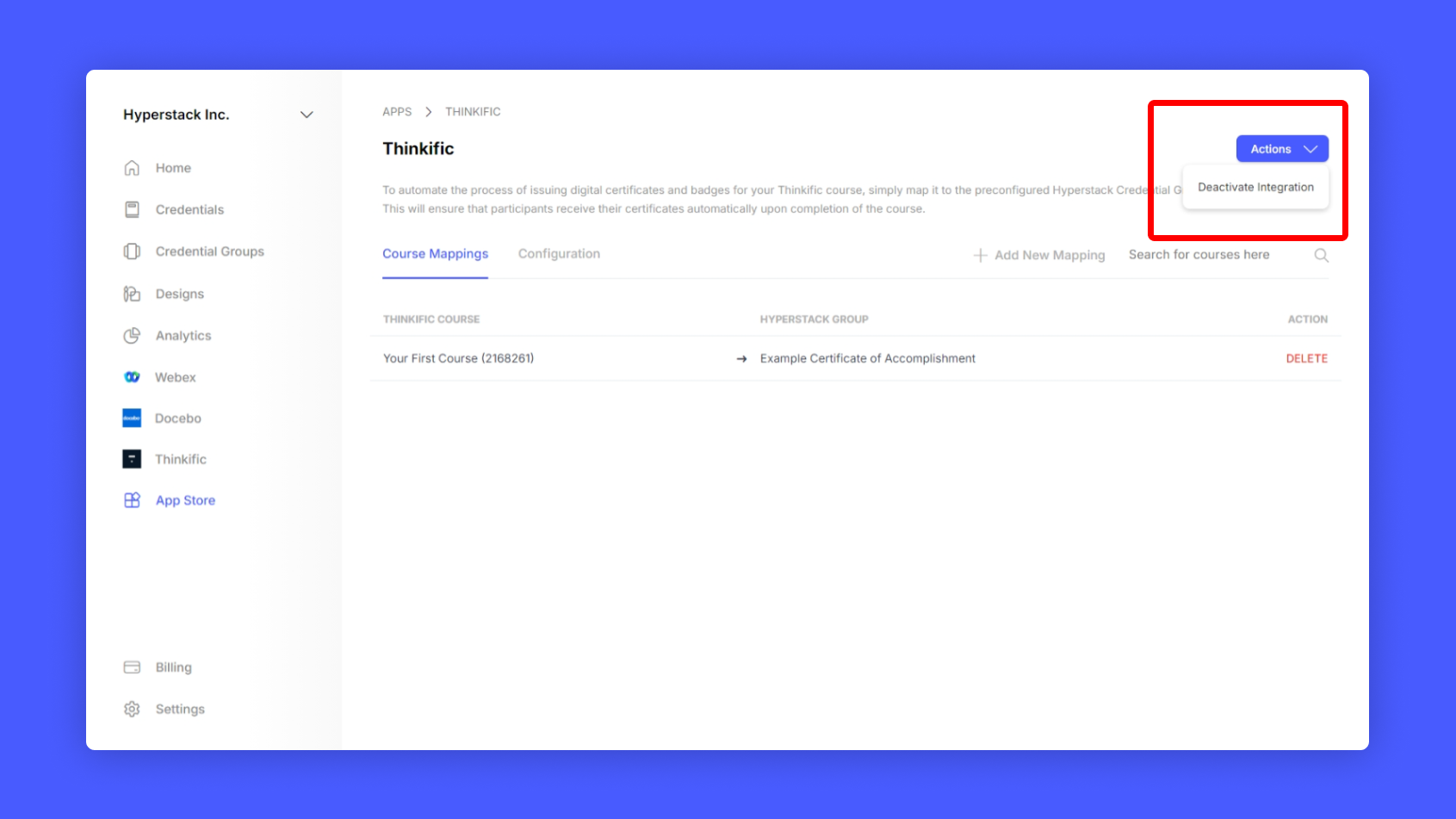 To uninstall Thinkific from Hyperstack. Simply go to the Thinkific Integration page in Hyperstack and Click Actions > Deactivate Integration to unlink Thinkific.