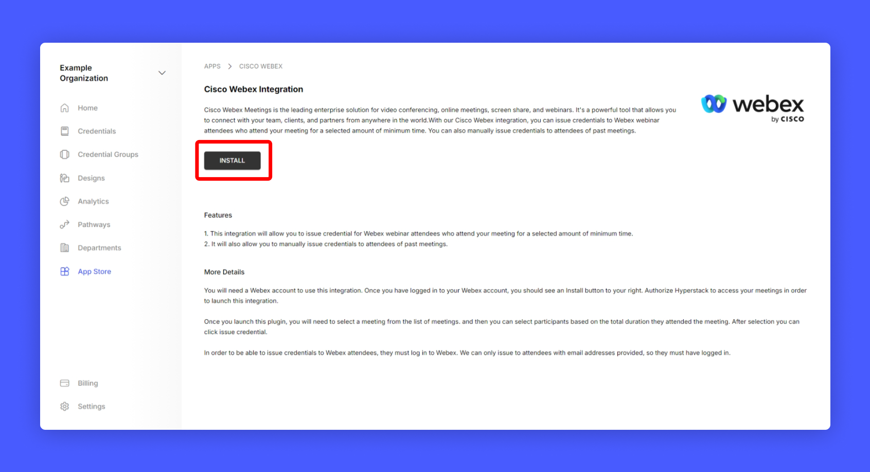 Step 2: On Webex integration page click Install to integrate Webex into Hyperstack.