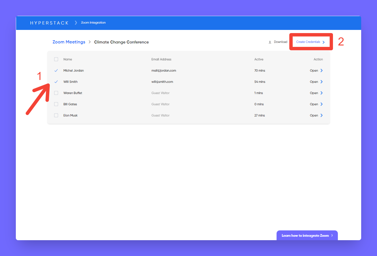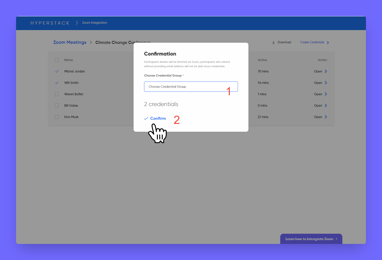 Step 7: Select the attendees and click Create Credentials to start issuing certificates to the selected attendees.