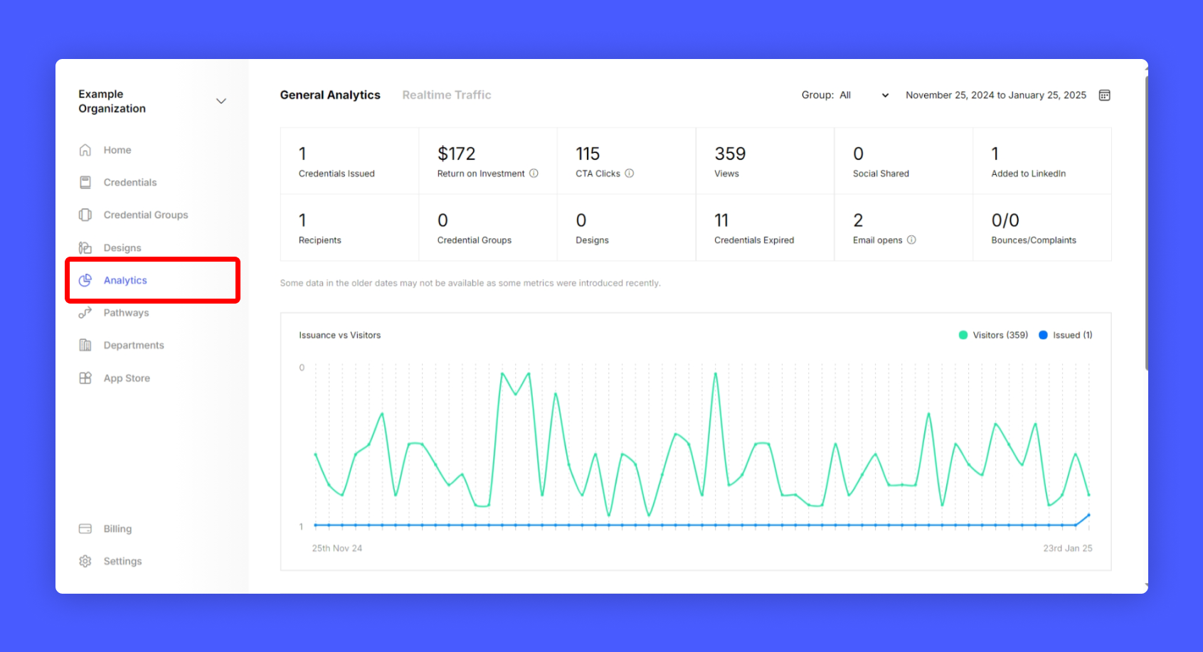 The Hyperstack Credential Cloud platform shows Analytics and Insights of the credentials that are issued through the platform. The issuer can look at Insights such as how well the issued certificates reach out to the public, look the amount of reach the issued credentials do on various platforms. This helps you to understand and identify the audience to run more informed social media marketing campaigns.