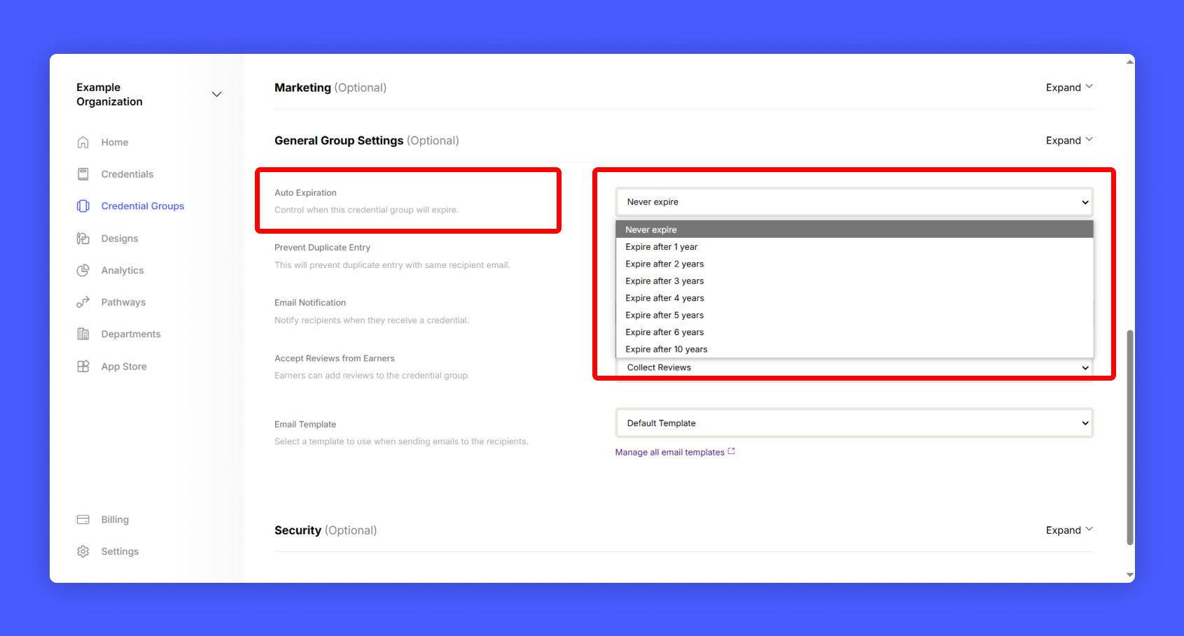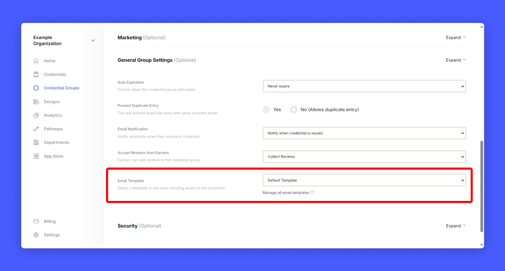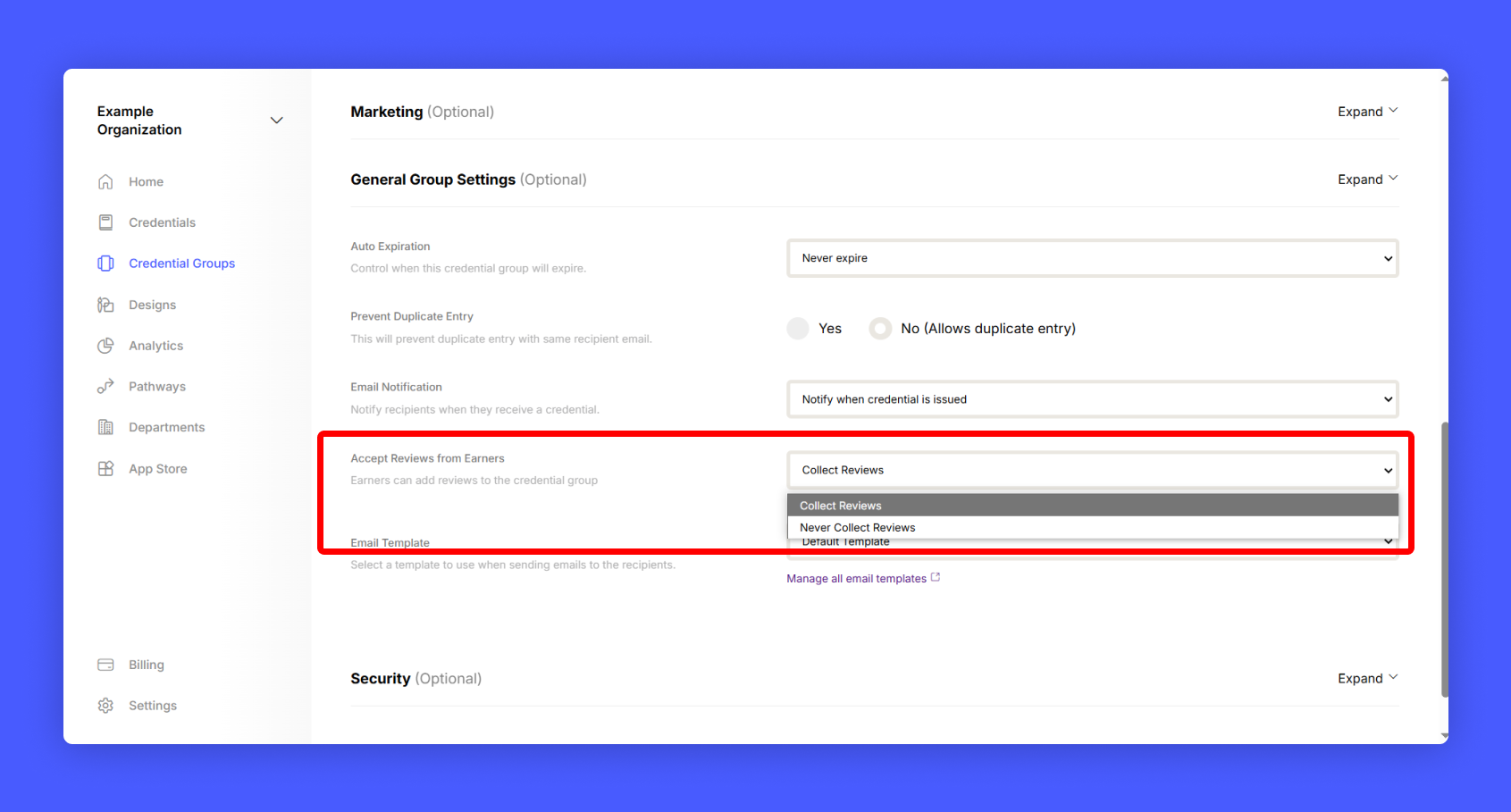 Accept Reviews from Earners: This allows recipient to add feedback to your credential group right from the email notification.