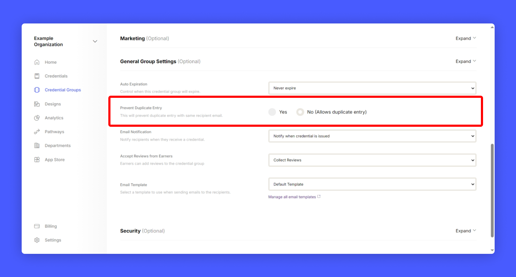 Want to prevent credential being sent to the same recipient twice or more? You can control the credential group by preventing credential duplication sent to the same recipient twice or more. This prevents all recipients from getting more than one credential from the same group.