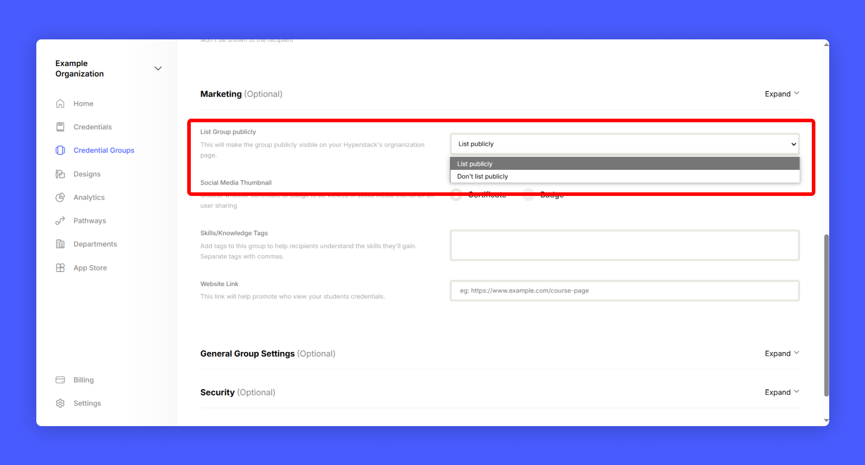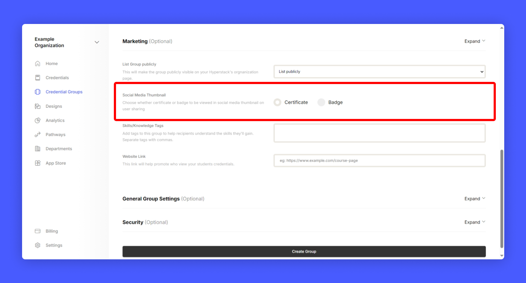 When your recipient shares the credential on social media, you can set whether the credential certificate or badge should be displayed as a thumbnail.