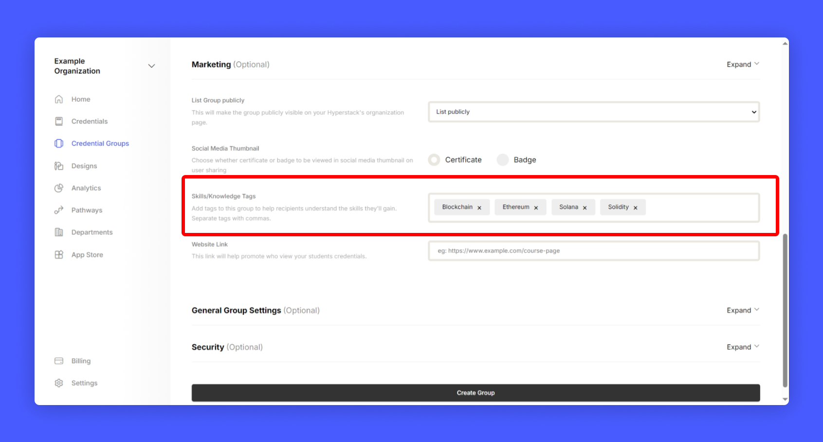 You can add skills and knowledge tags to your credential group. This helps in when recruiters search for candidates with specific skills.