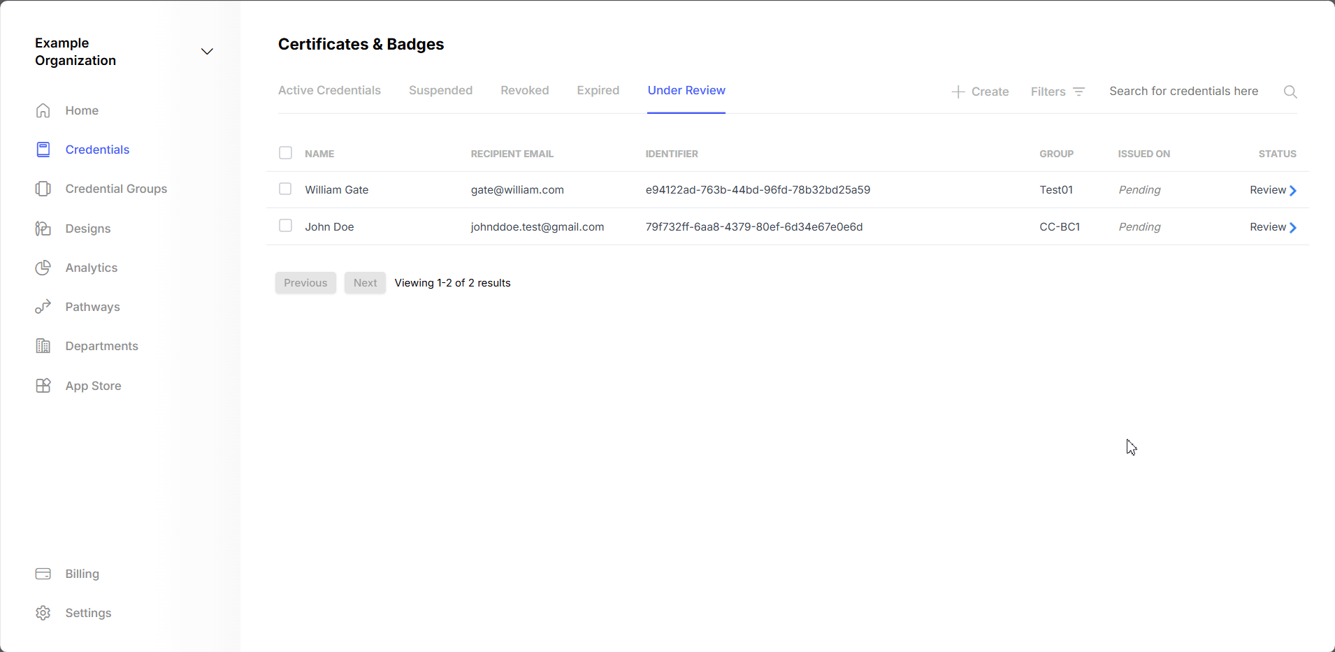- Go to the Credentials page from the home page. or If the credential is not published yet, go to the Under Review page from the home page.