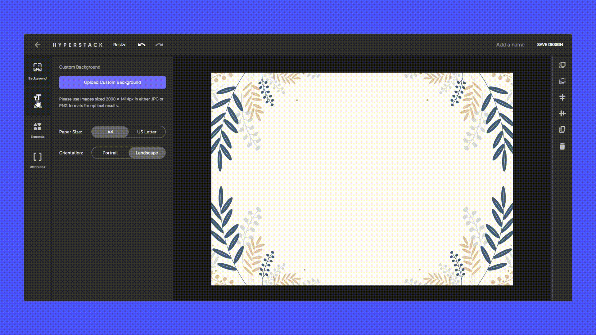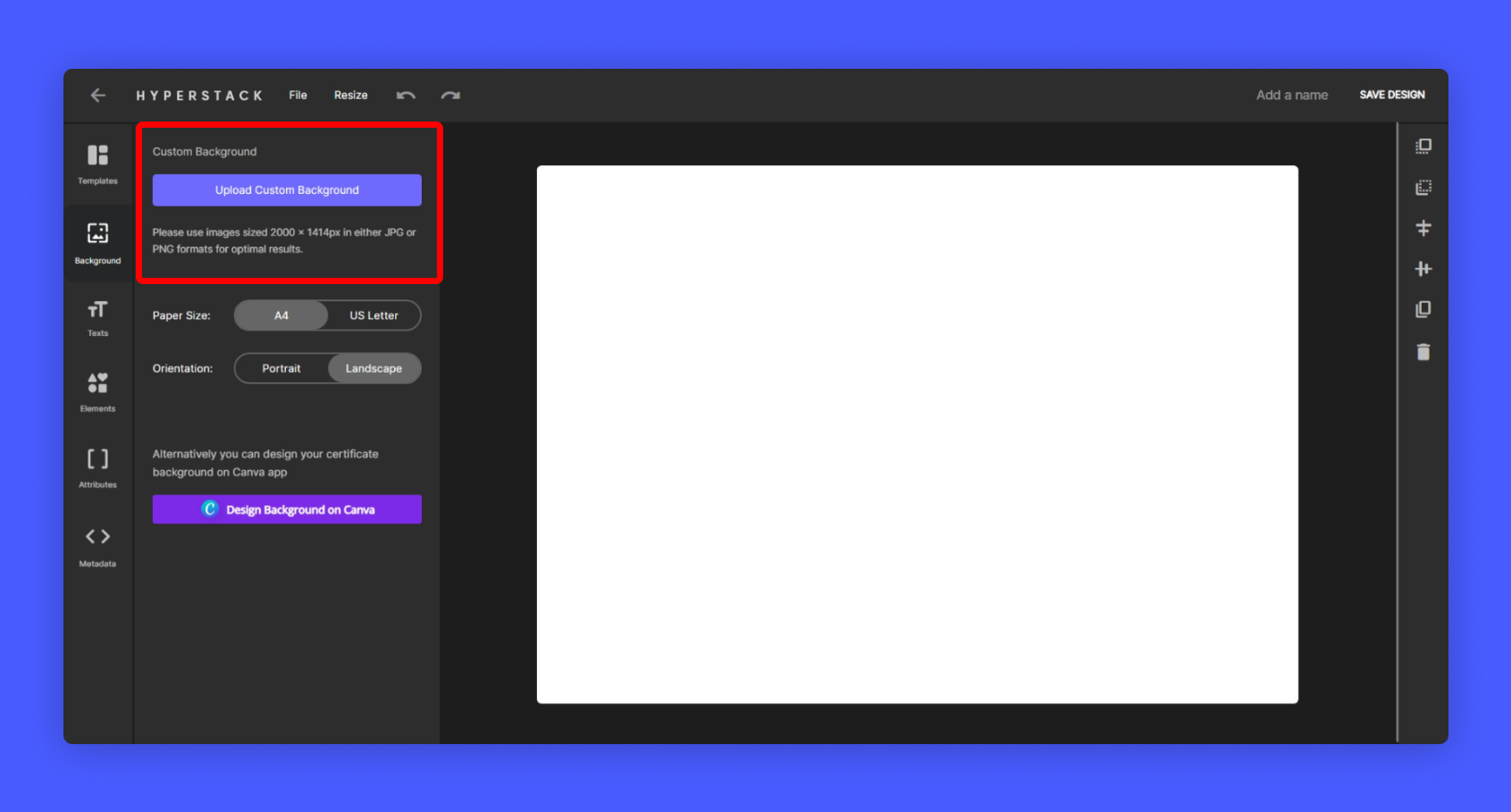 Go to Background section and click Upload Custom Background button to upload your certificate background image.