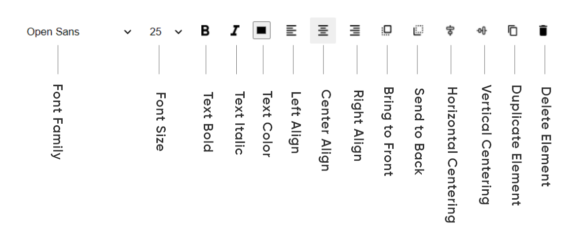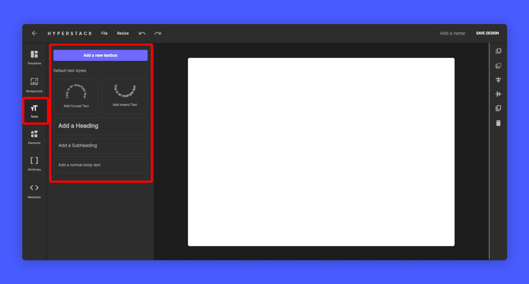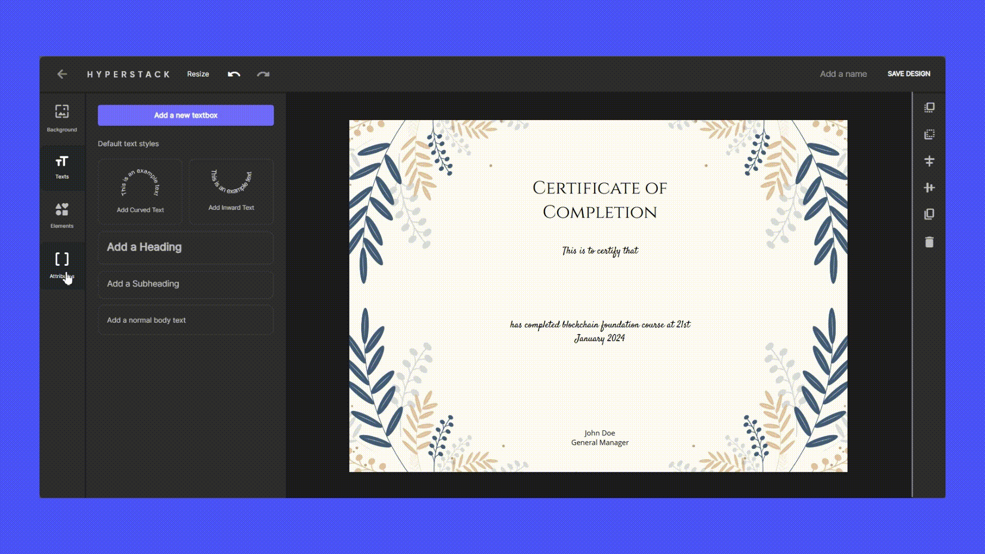 You can add Texts to your certificate by clicking on the Texts section and Select the desired text format you wish to add in your certificate.