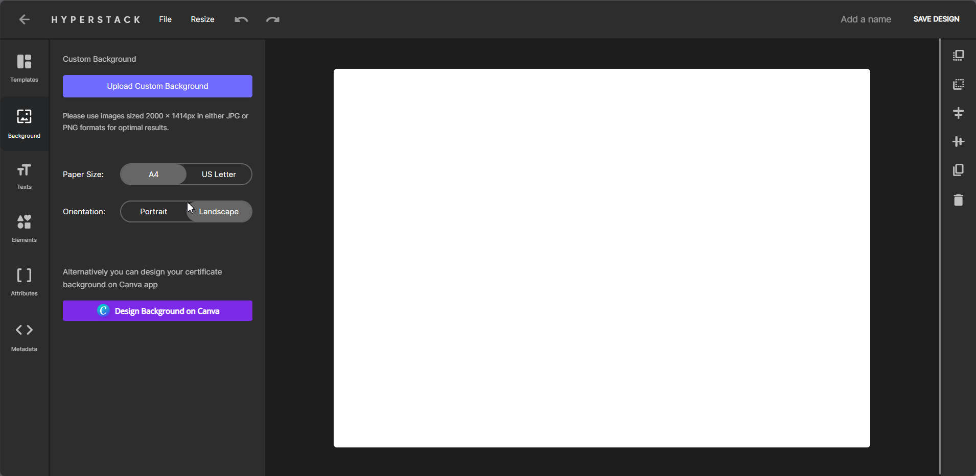 You can switch between portrait mode and landscape mode for designing certificate in the background section.