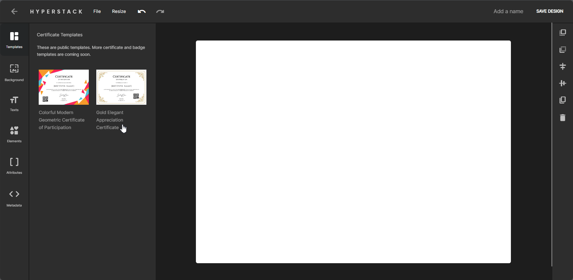 You can add QR Code to your certificate by clicking on the Elements section and Click QR Code button to add QR code to your certificate.