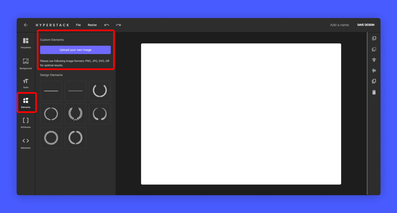 You can add Logos, Signature and Images to your certificate by clicking on the Elements section and Click Upload Custom Image button to upload your images/logos/Signatures to the certificate.