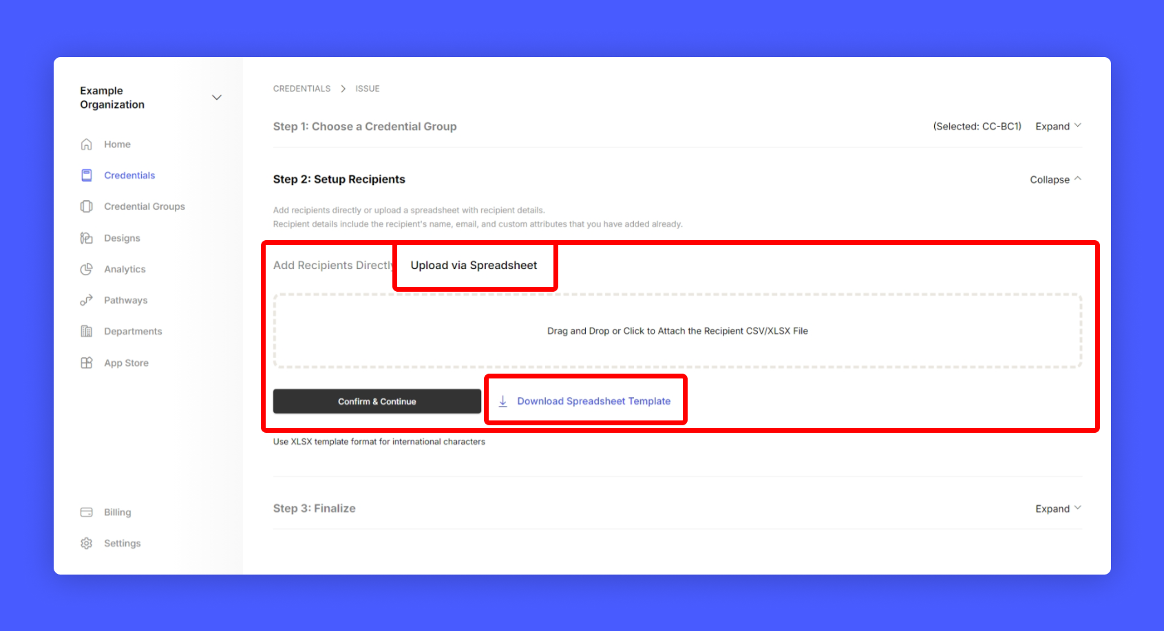 Step 5: Attach the Spreadsheet and click Confirm and Continue.