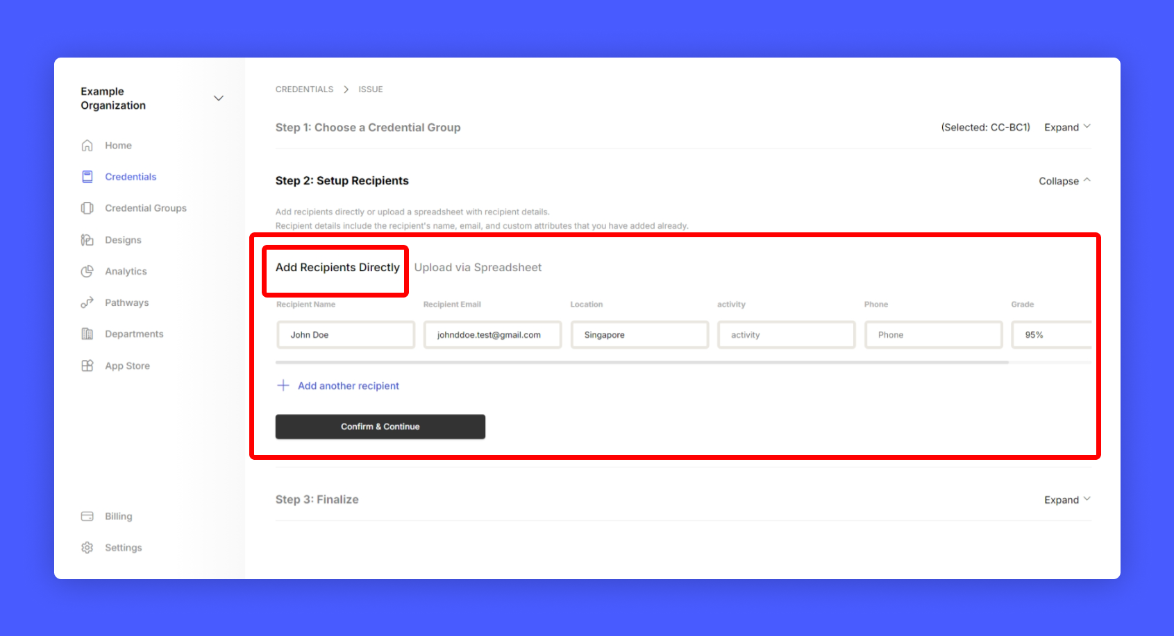 Issuing the certificates and badges on the Credential Cloud is simple, Once you import/design your dynamic certificate/ badge design and create a credential group for the course/program you can start issuing the credentials for the same.