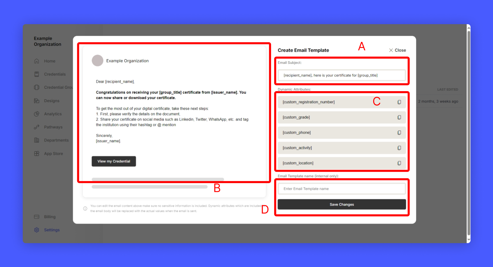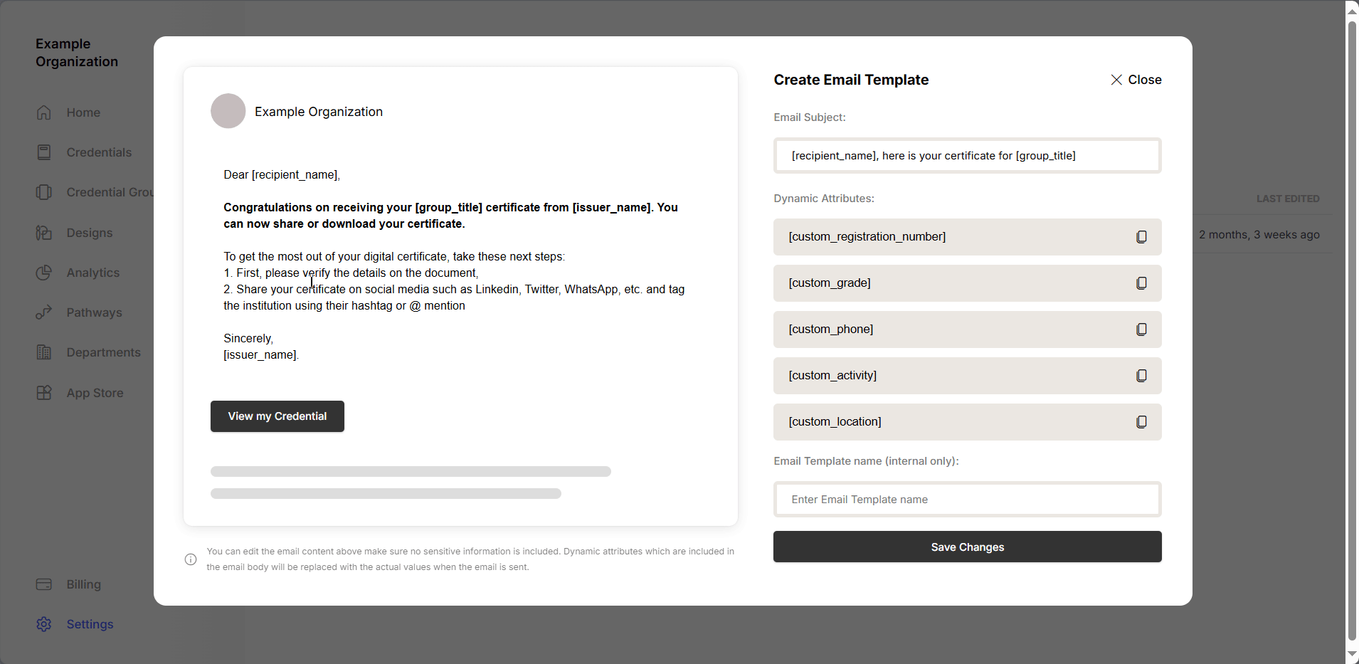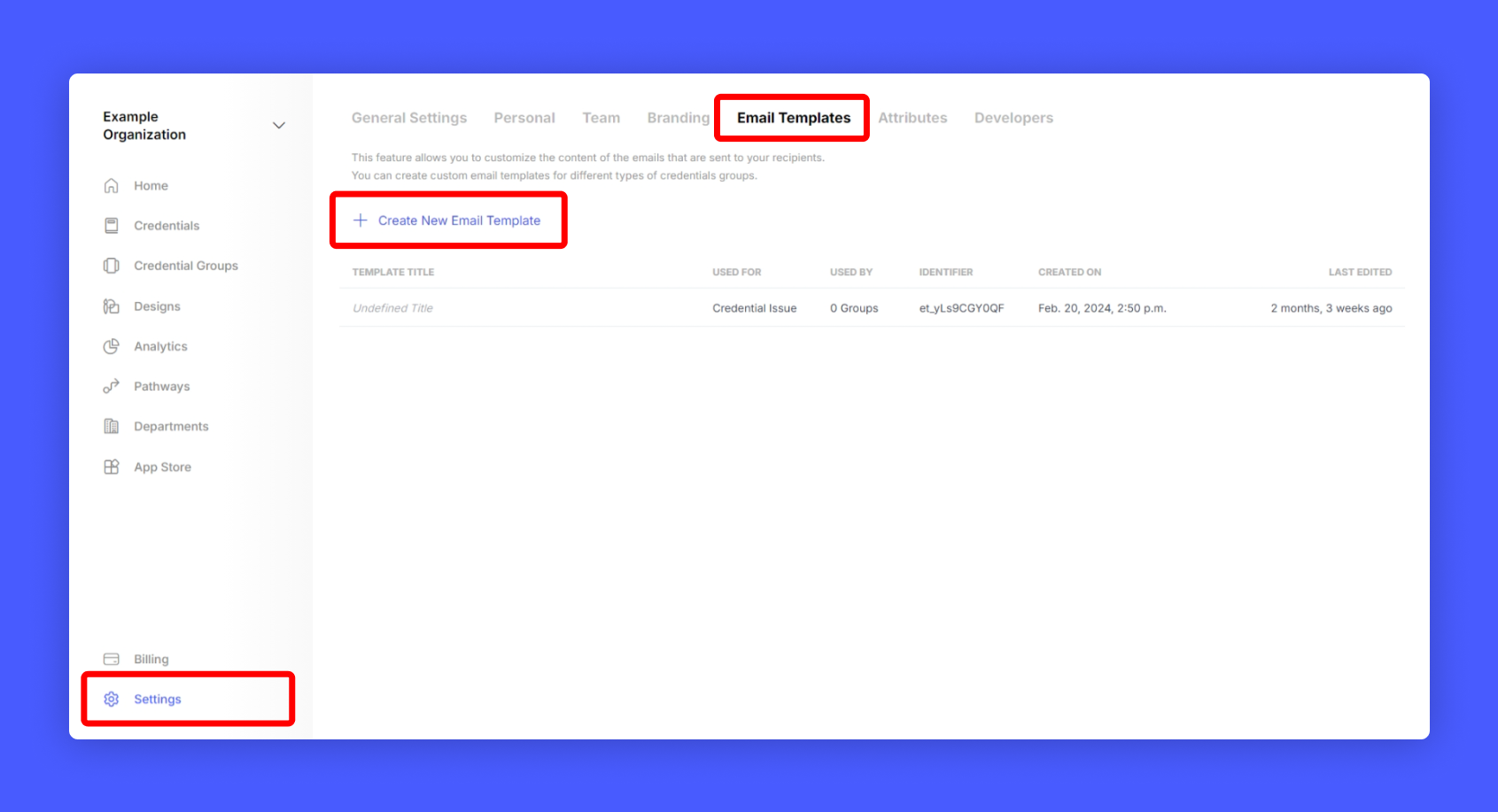 Step 1: Click Settings > Email Templates from your issuer home screen and select Create Email Template.