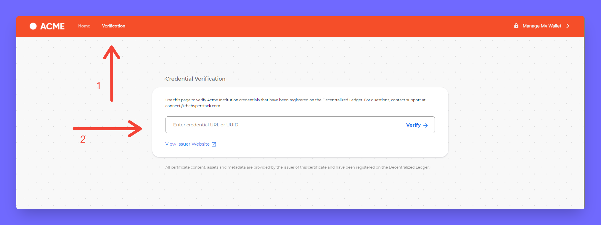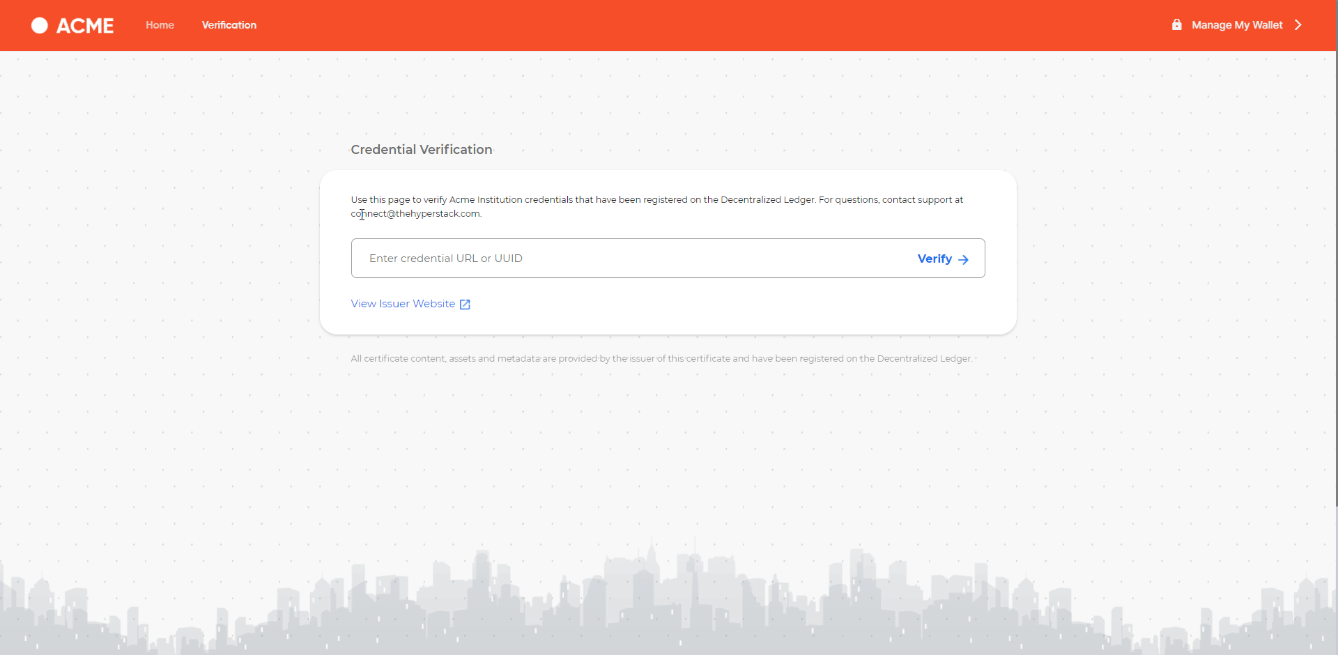The verification page helps the verification organizations/parties to verify credentials issued on the hyperstack credential cloud platform.