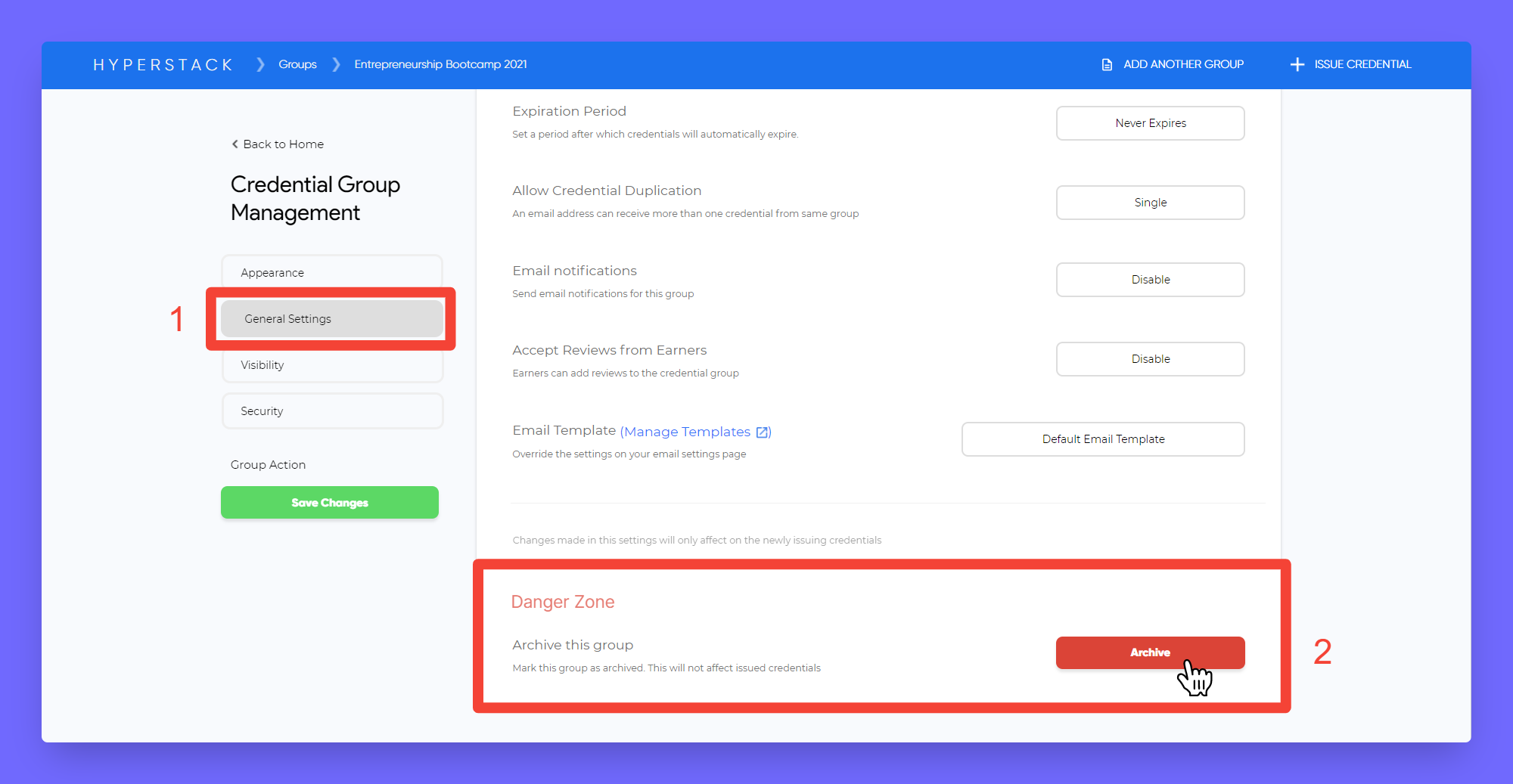 Step 2: Scroll to bottom, Under "Danger Zone" click Archive button to archive this group.